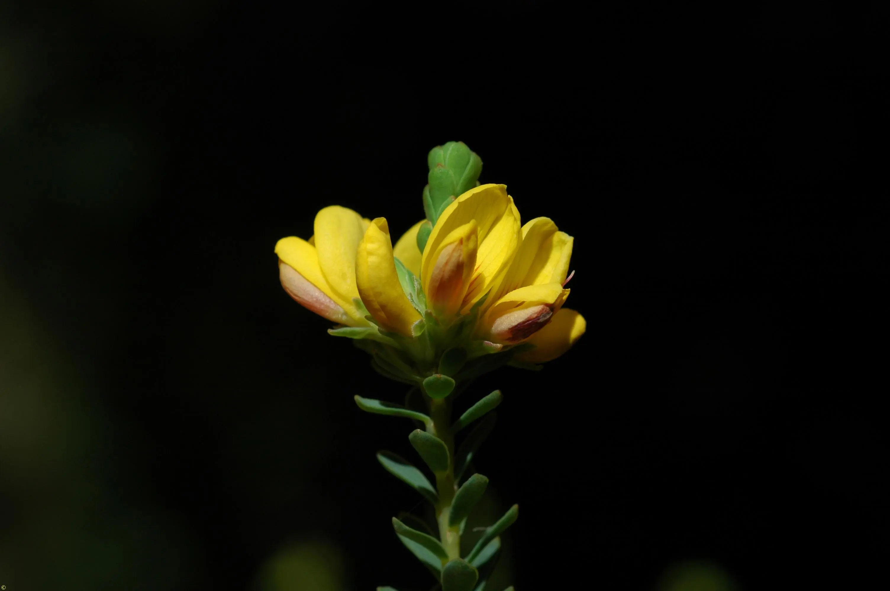 Flowers: Pea flowers, almost stalkless, with deep orange-yellow petals and purple markings on wings.