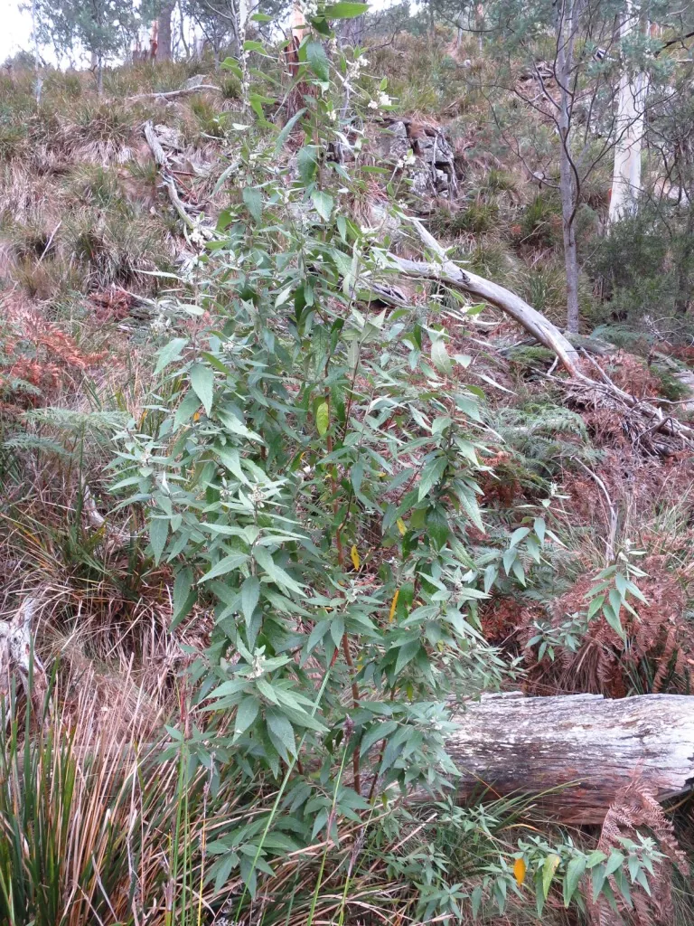 Form Description: Medium to tall shrub or small tree, branches covered with stellate hairs when young, leaves alternate, many stellate hairs below.