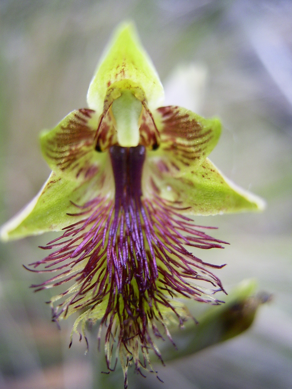 Flowers: Widely spreading floral segments and a labellum with dense bushy beard, recurved apex and 2 prominent broad blue plates completely covering the base. Column with eye spots.