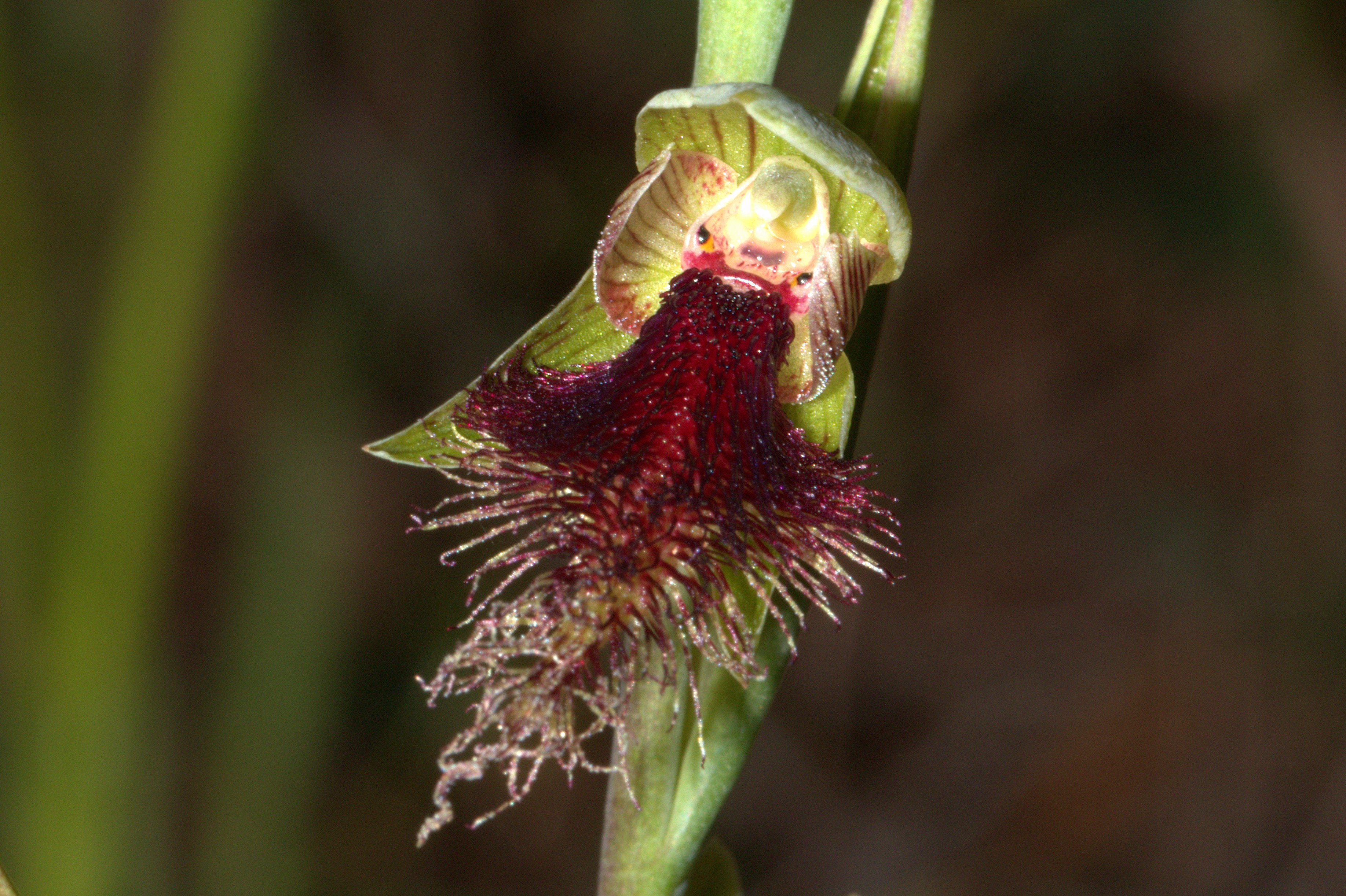 Flowers: 1-9 flowers. Widely spreading perianth segments, purple labellum hairs with the basal ones reduced to small purple calli, and 2 prominent dark purple eye spots at the base of the column wings.