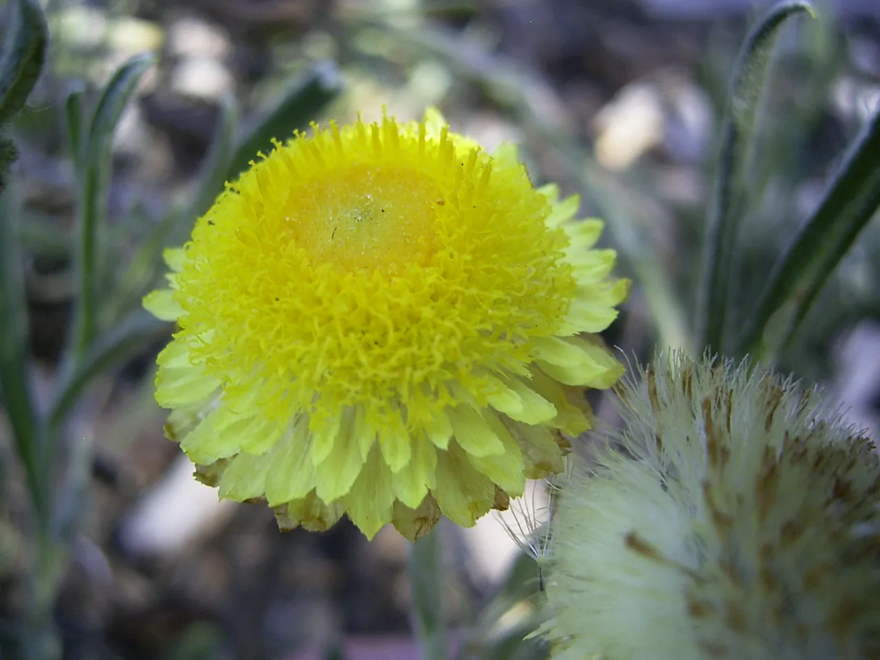 Flowers: Yellow paper daisy alone on a stem arising from a rosette of pale leaves with loose hairs.
