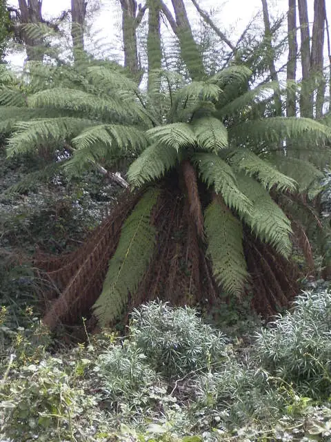 Form Description: Large tree fern, trunk to 1m diameter, densely covered with brown fibrous roots. Large crown of dark green fronds to 4m long.