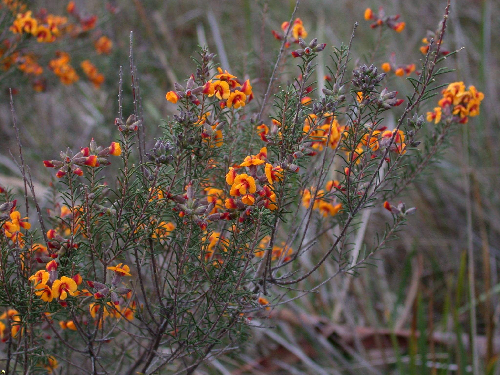 Flowers: Pea 3-8 together in terminal clusters. Petals orange with dark red, keel blunt, purplish red.