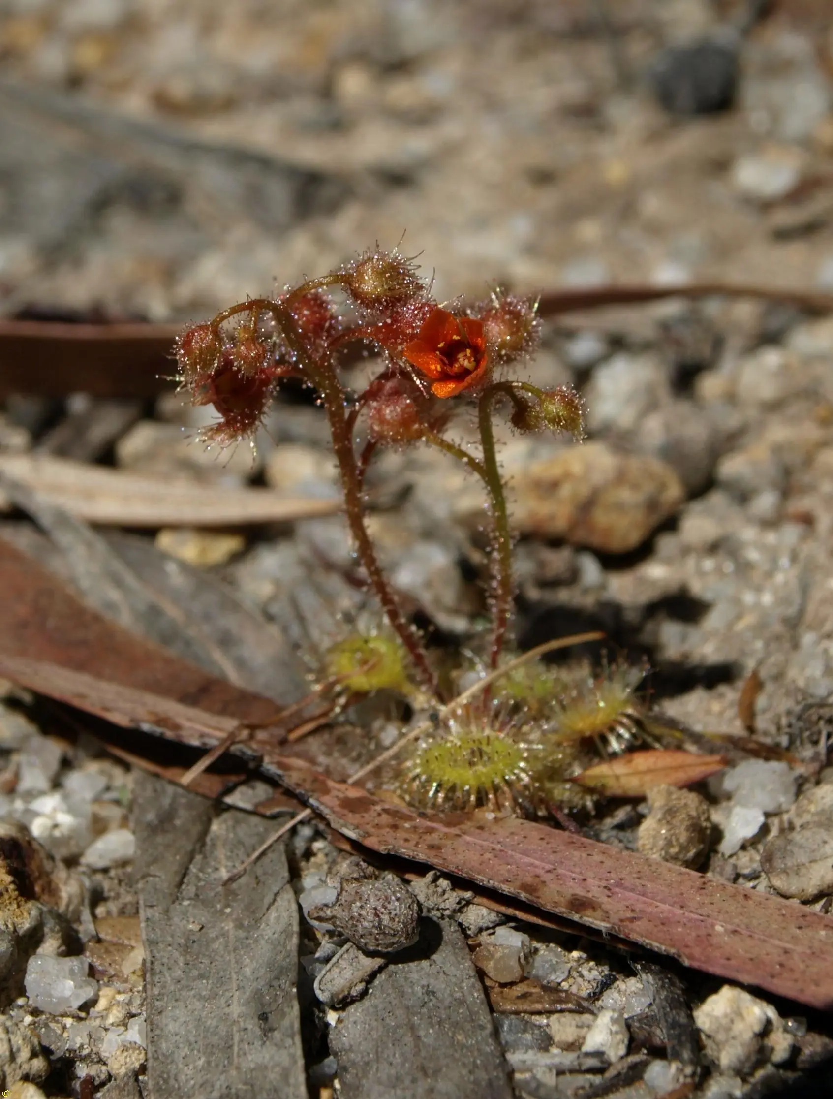 Form Description: Ground-hugging, insectivorous rosette herb, with leaves which vary in colour from green to yellow or bright red. Leaves 3cm long, with glandular hairs.