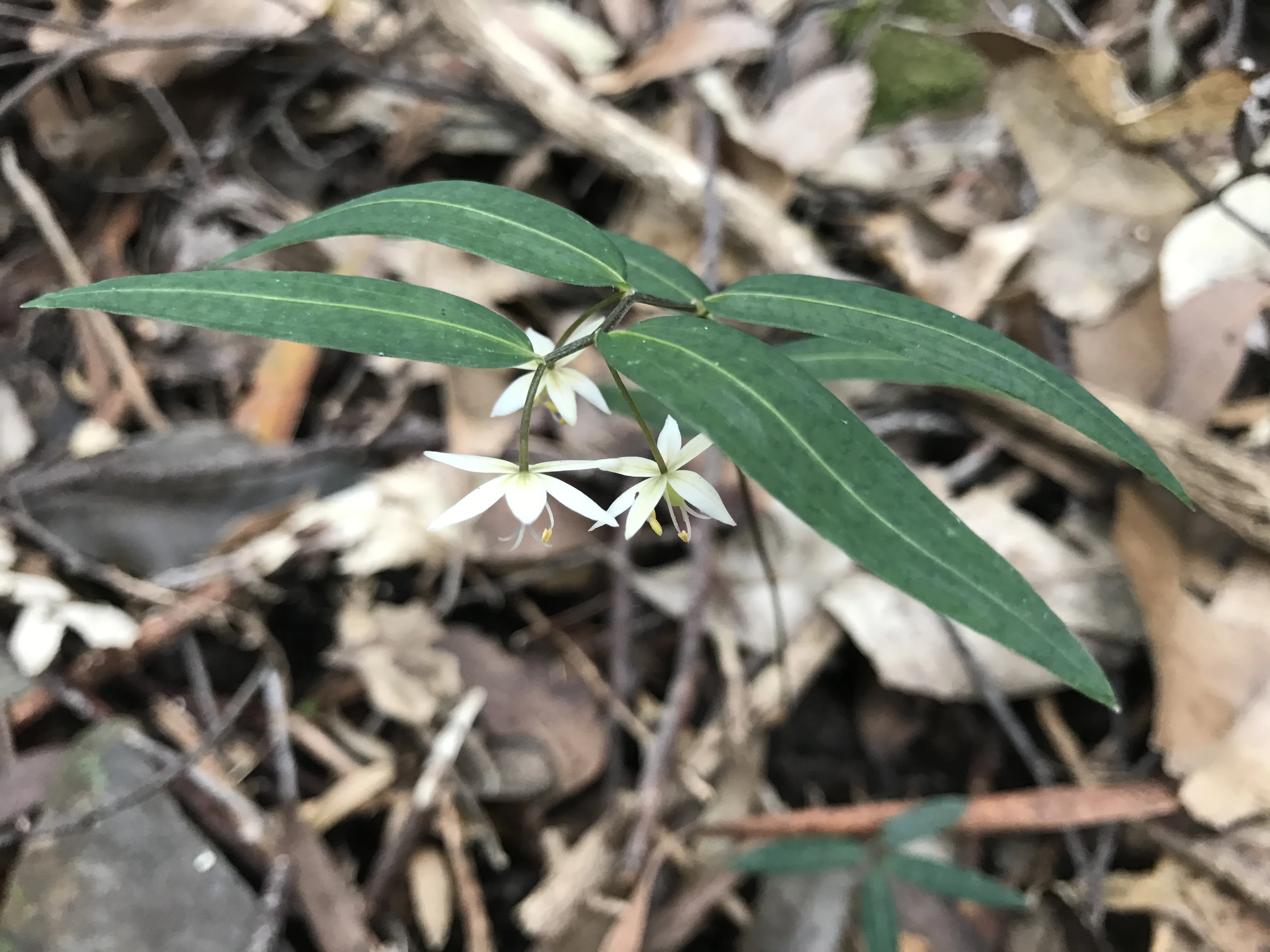 Flowers: White, 1.5cm diameter, shortly stalked in the axils of the leaves, facing downwards.