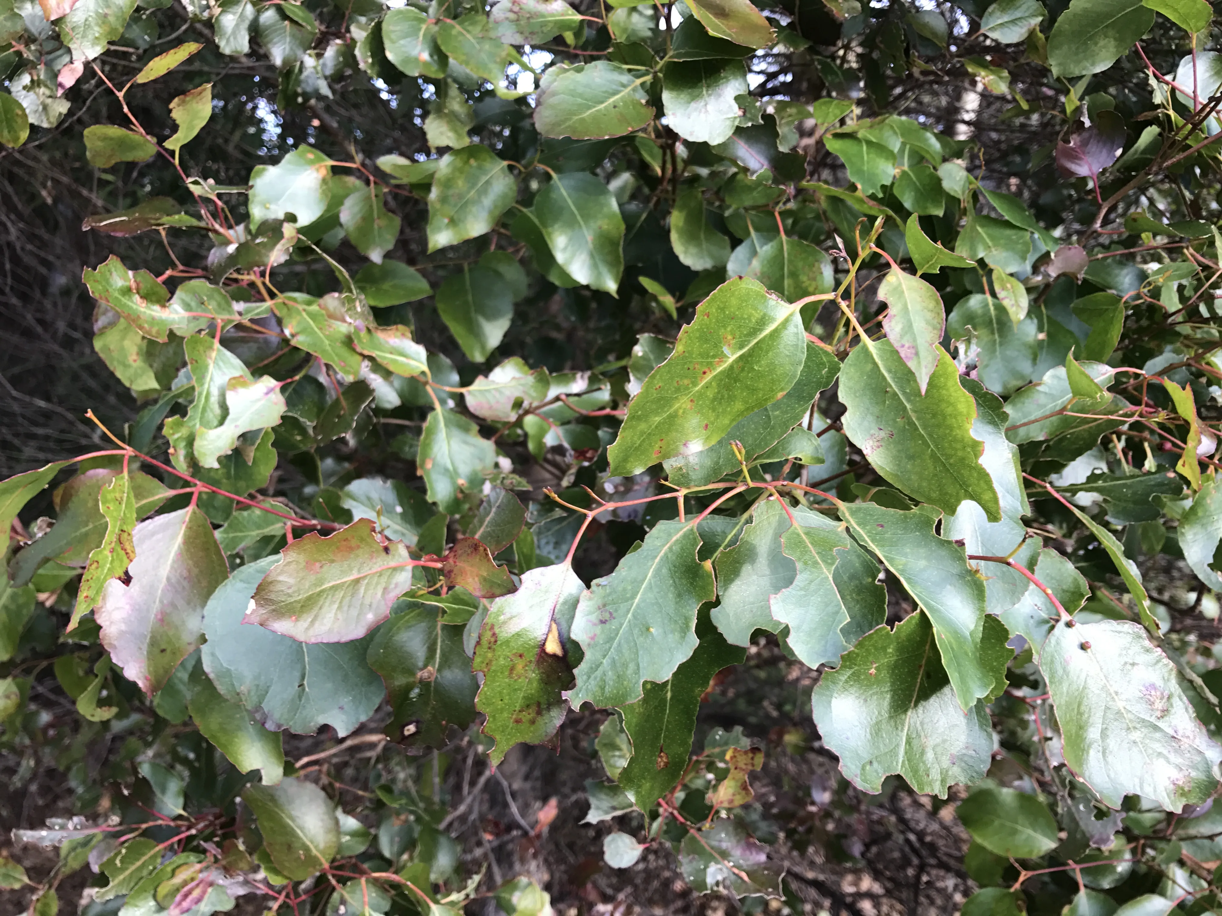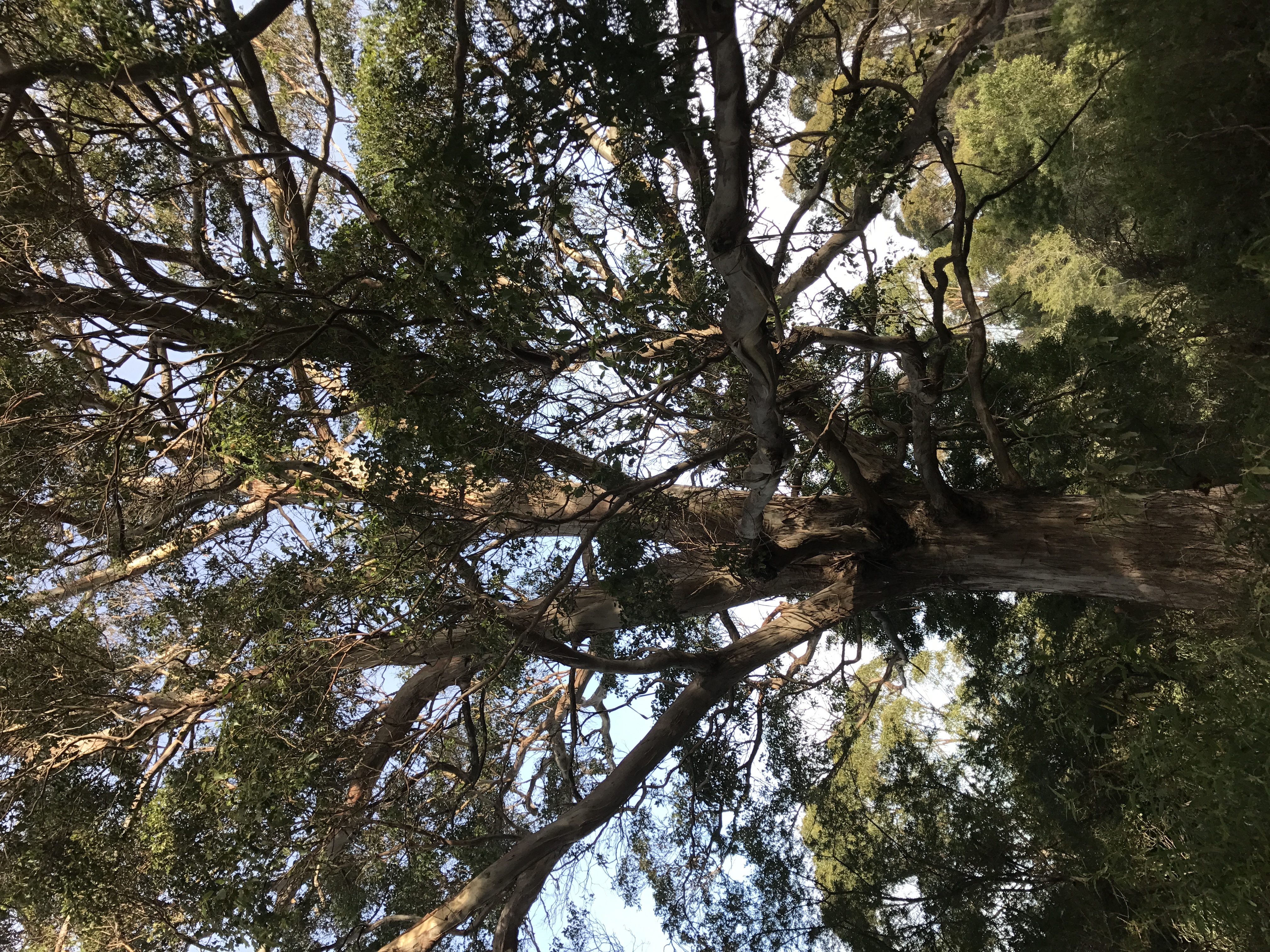 Form Description: Shrub to tall tree. Leaves: Juvenile – petiolate and ovate with round-toothed margins, glossy, dark green with obvious oil dots. Adult – ovate to lanceolate, glossy, dark green, thin and undulate(wavy). Discolorous. Bark: Rough at the base but flaking to reveal dark grey, green or orange patches.