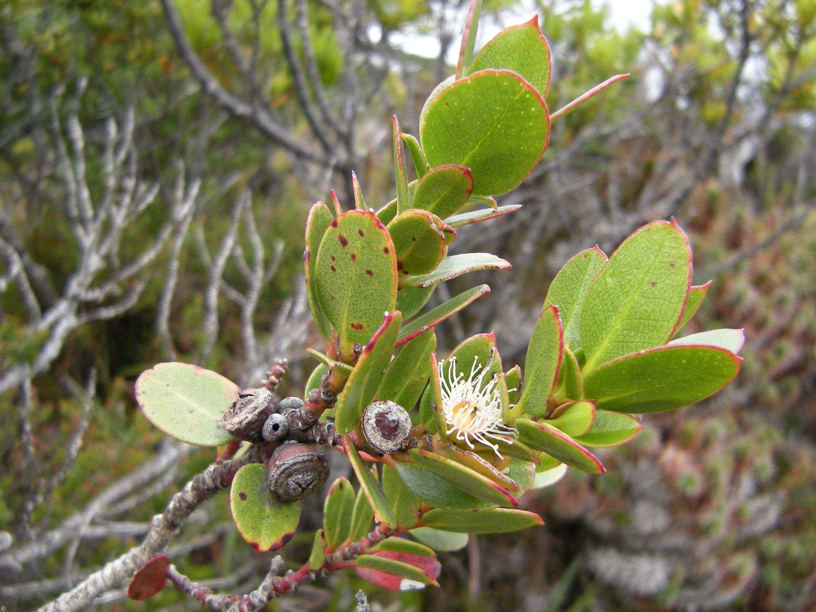 Form Description: Small shrub of mallee habit. Leaves: Juvenile and adult leaves are very similar. Very small (2.5mm long), round to ovate with a small point on the apex, sessile to shortly petiolate, green, glossy and leathery. Bark: Smooth and streaked grey, green and orange when new.