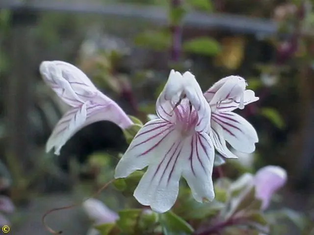 Flowers: At ends of branches, up to 15 flowers. Scented, with creamy white petals, sometimes with a pink-purple tinge, particularly on the back of the hood. The petals can have purple stripes extending from the flower throat.