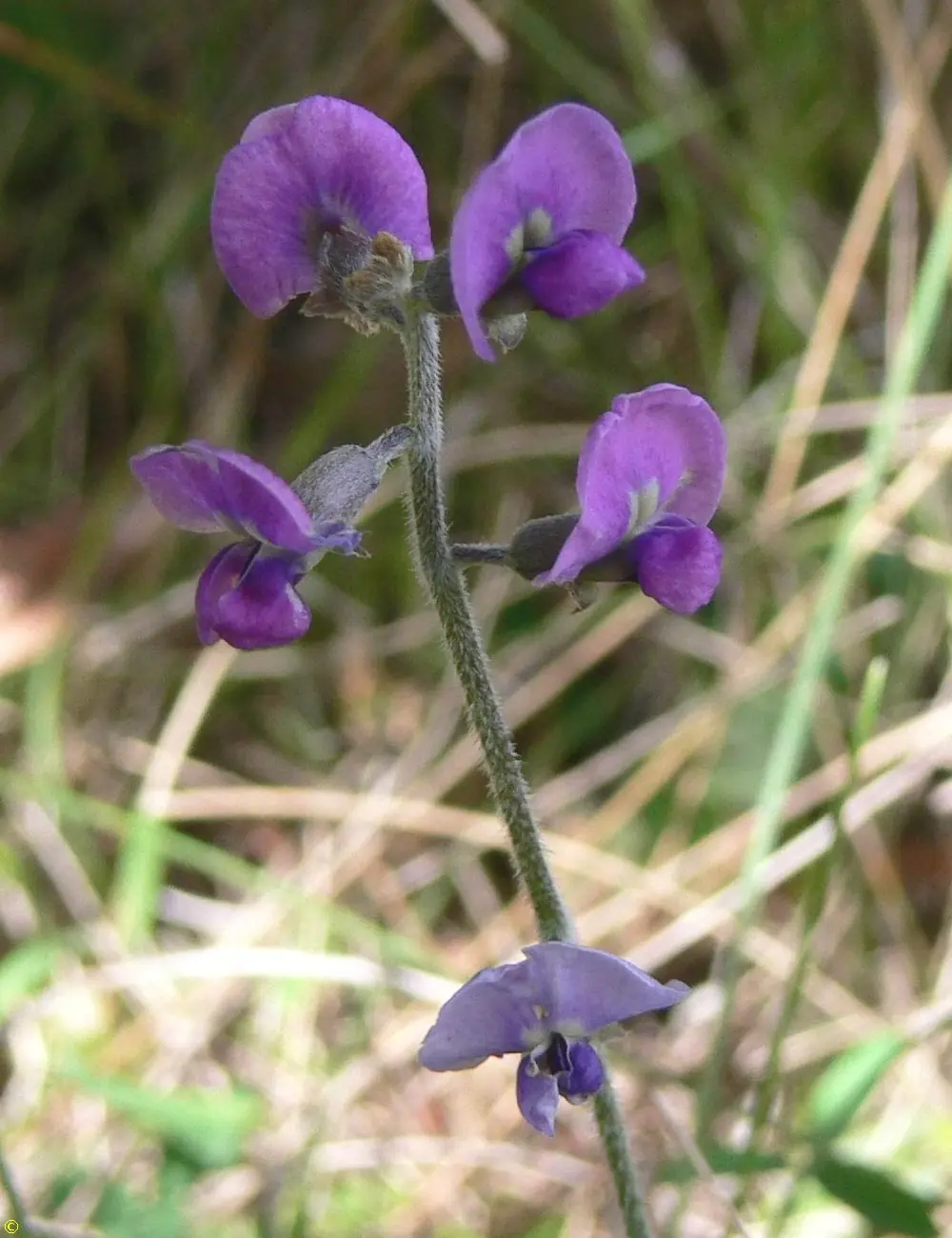 Flowers: 8-20 pea flowers in clusters usually crowded near ends of stalks. Similar to Glycine clandestina.
