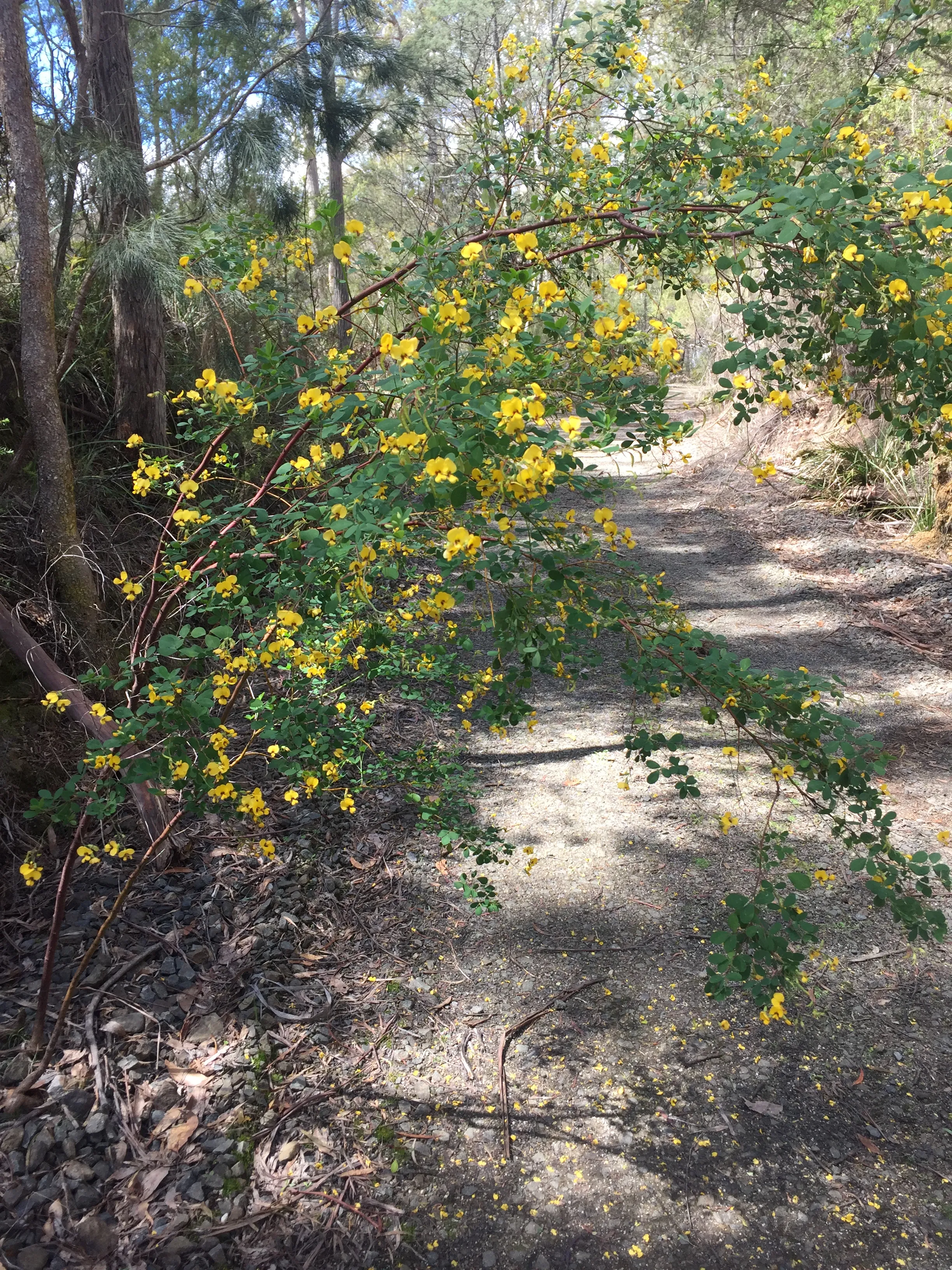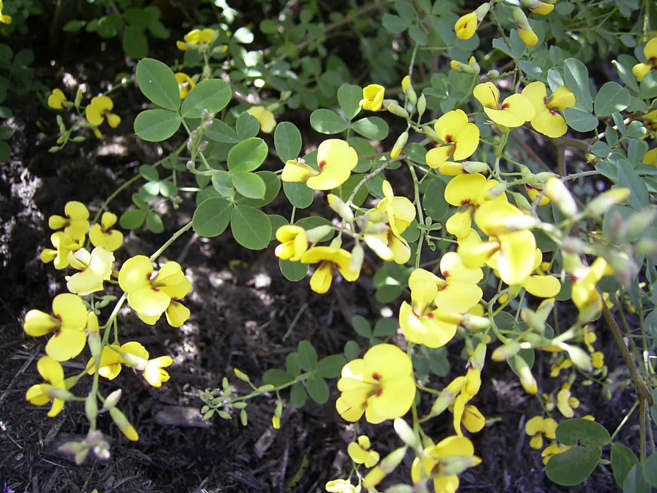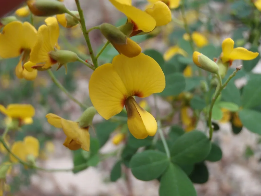 Flowers: Pea flowers, bright yellow with red-brown throat.