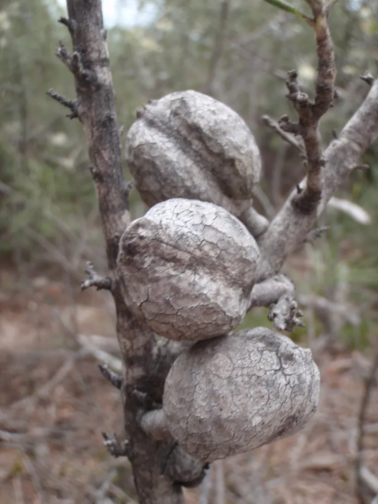 Fruit: Seed follicles – brownish-purple, hard woody, warty with small beak. Seeds winged, usually two per fruit.