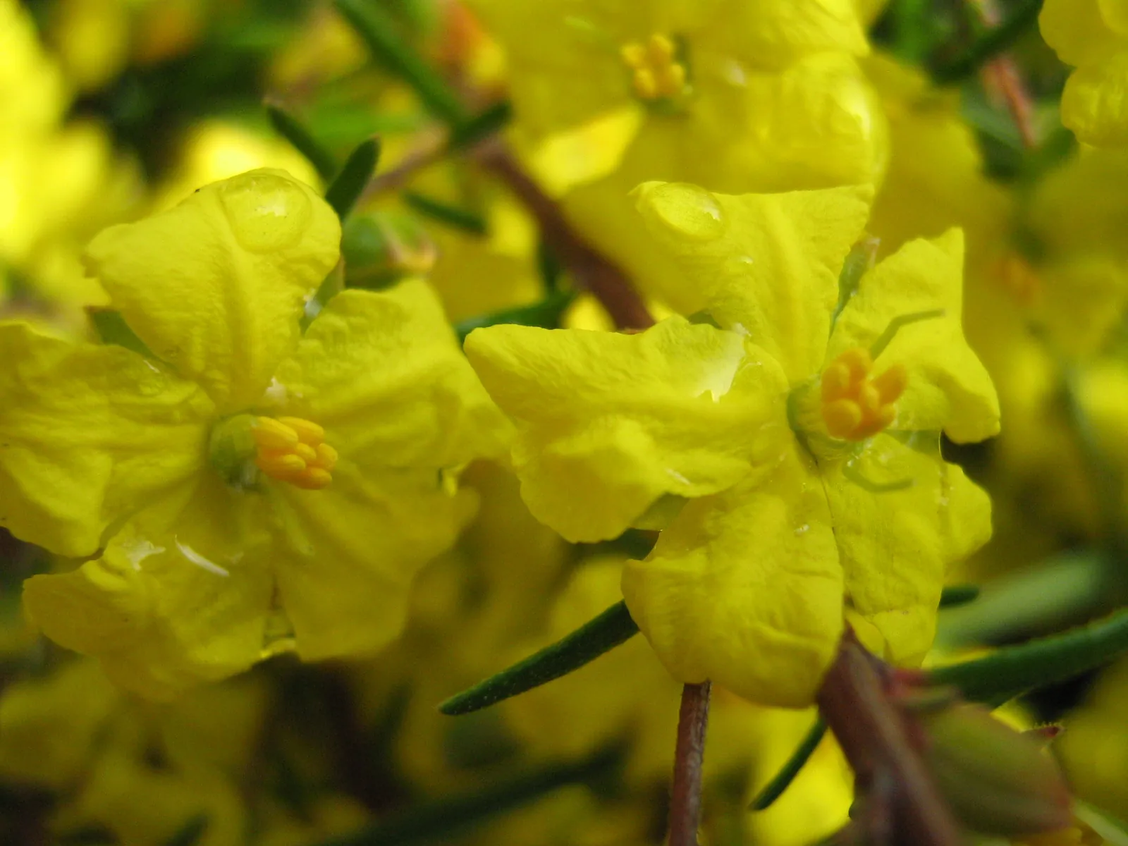 Flowers: Golden yellow, 1-2cm diameter, petals deeply notched. Borne on ends of short branches.