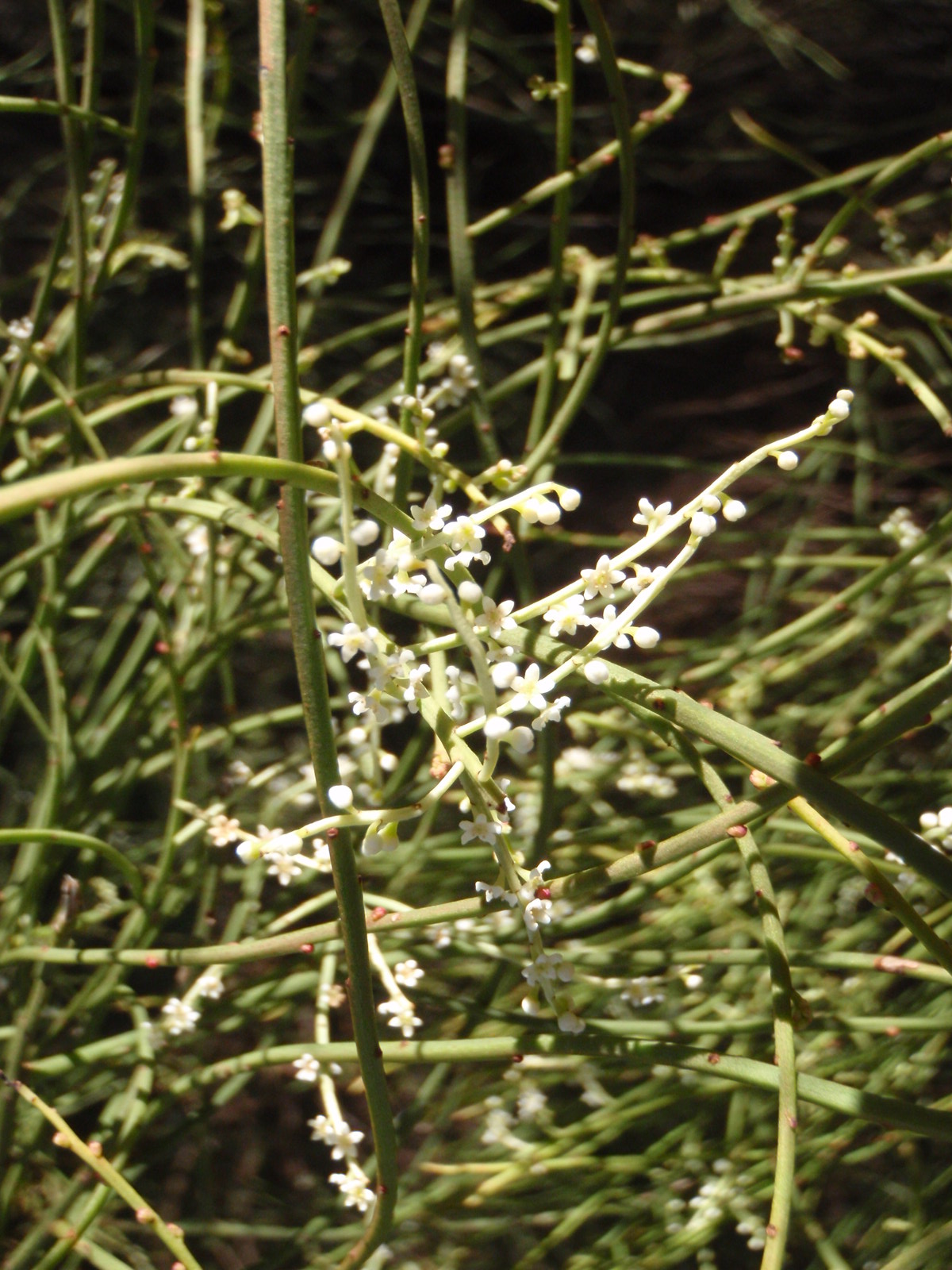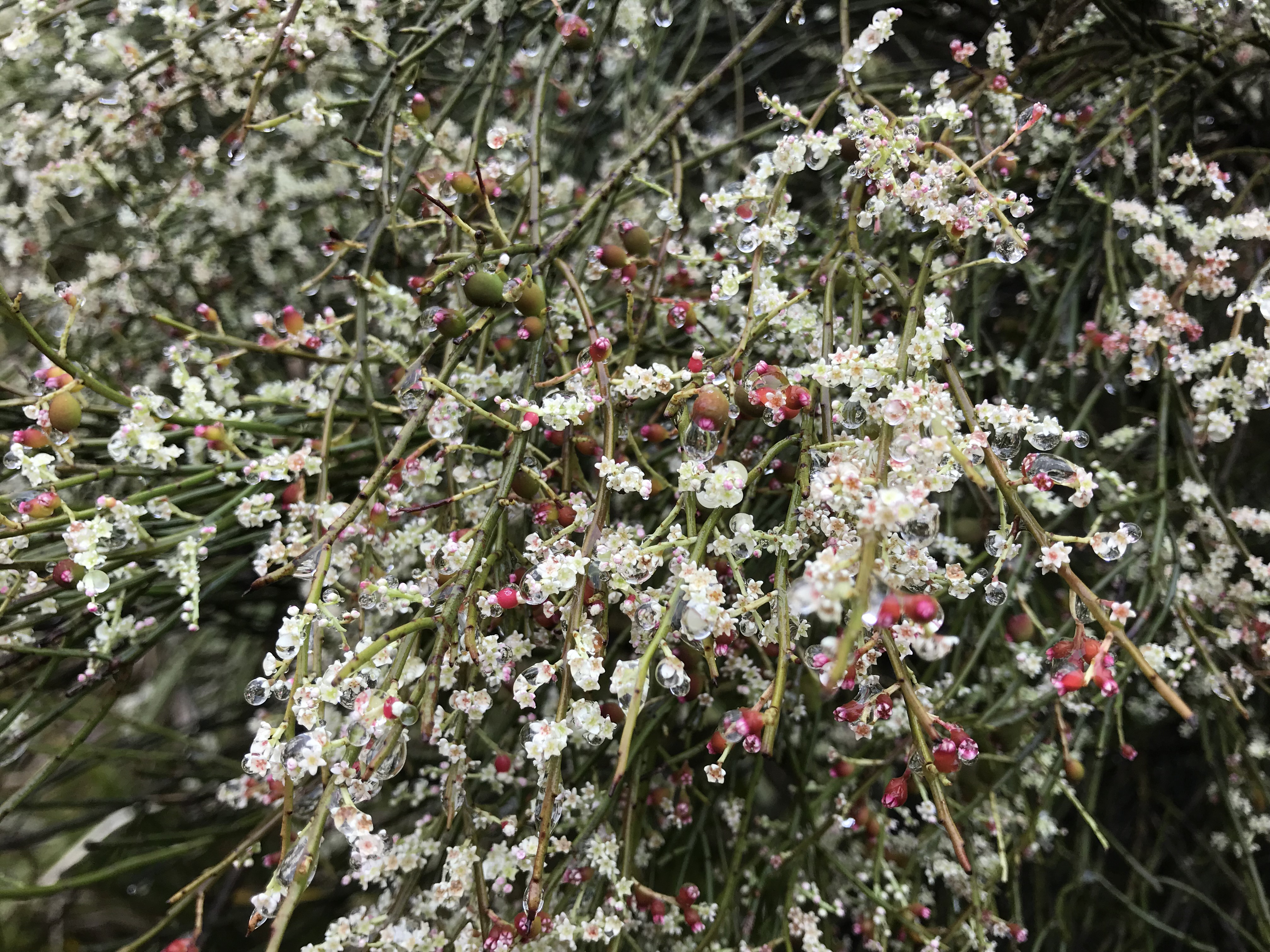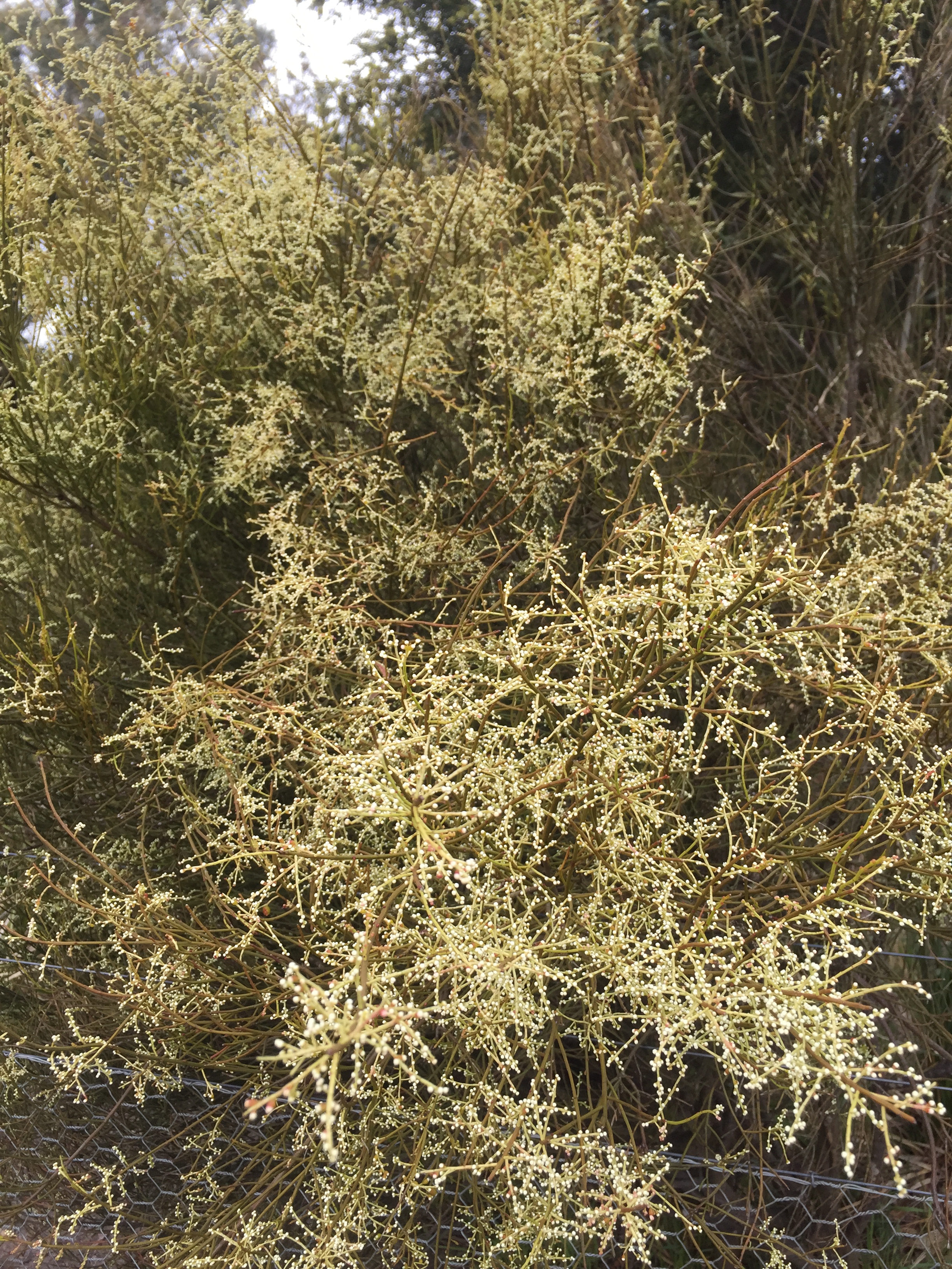 Flowers: Cream, very small (under 3mm across) and numerous in spikes on the twiggy branches.