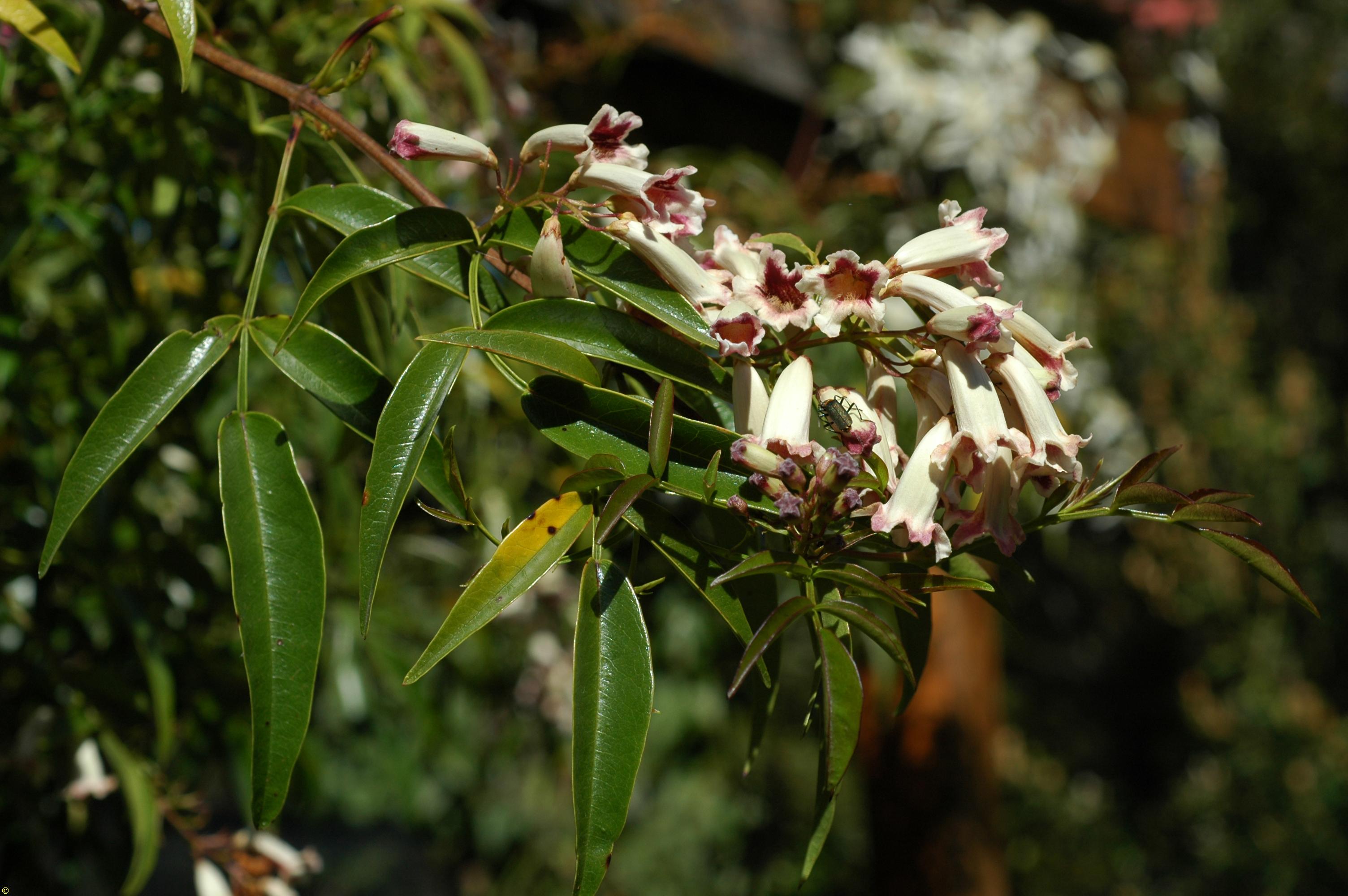 Fruit: Capsule – pod-like, 4-7cm long, containing flat seeds surrounded by a broad, transparent wing. Capsule turns from green to yellow and mottled with brown, and release the winged, red-brown seed at maturity.
