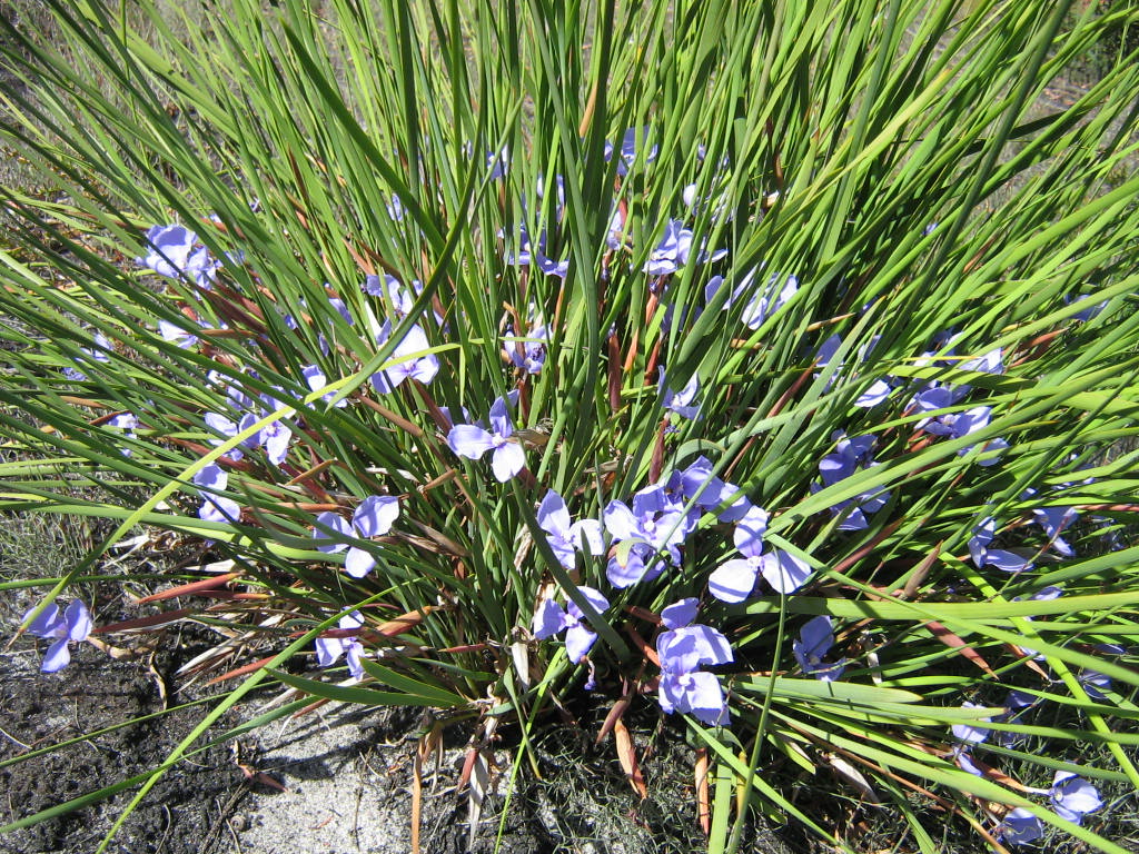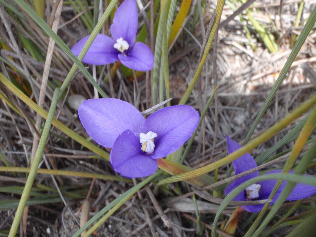 Flowers: Blue-mauve, 6-lobed. 3 outer lobes: large, rounded, spreading; 3 inner: tiny and erect.
