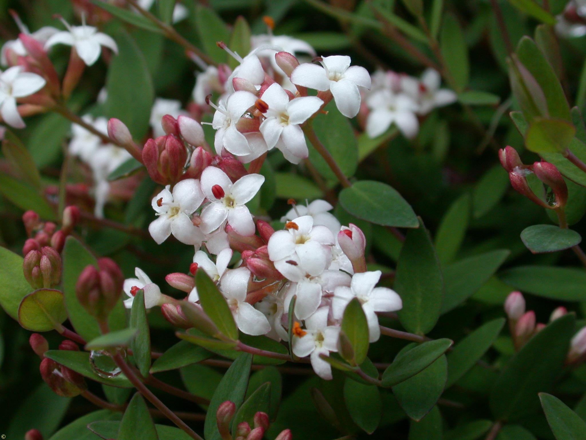 Flowers: Clusters of 6-9 flowers at end of branch, very slender stems. Flowers, 5mm, white to deep pink; tubular.