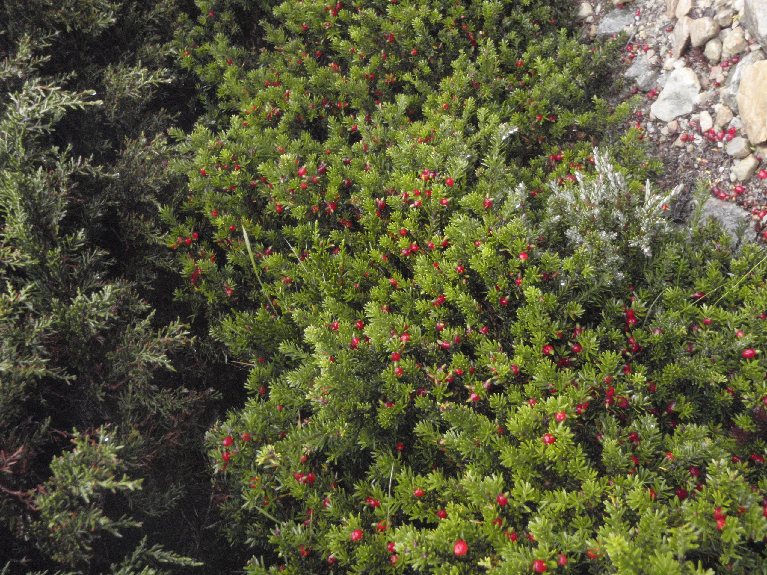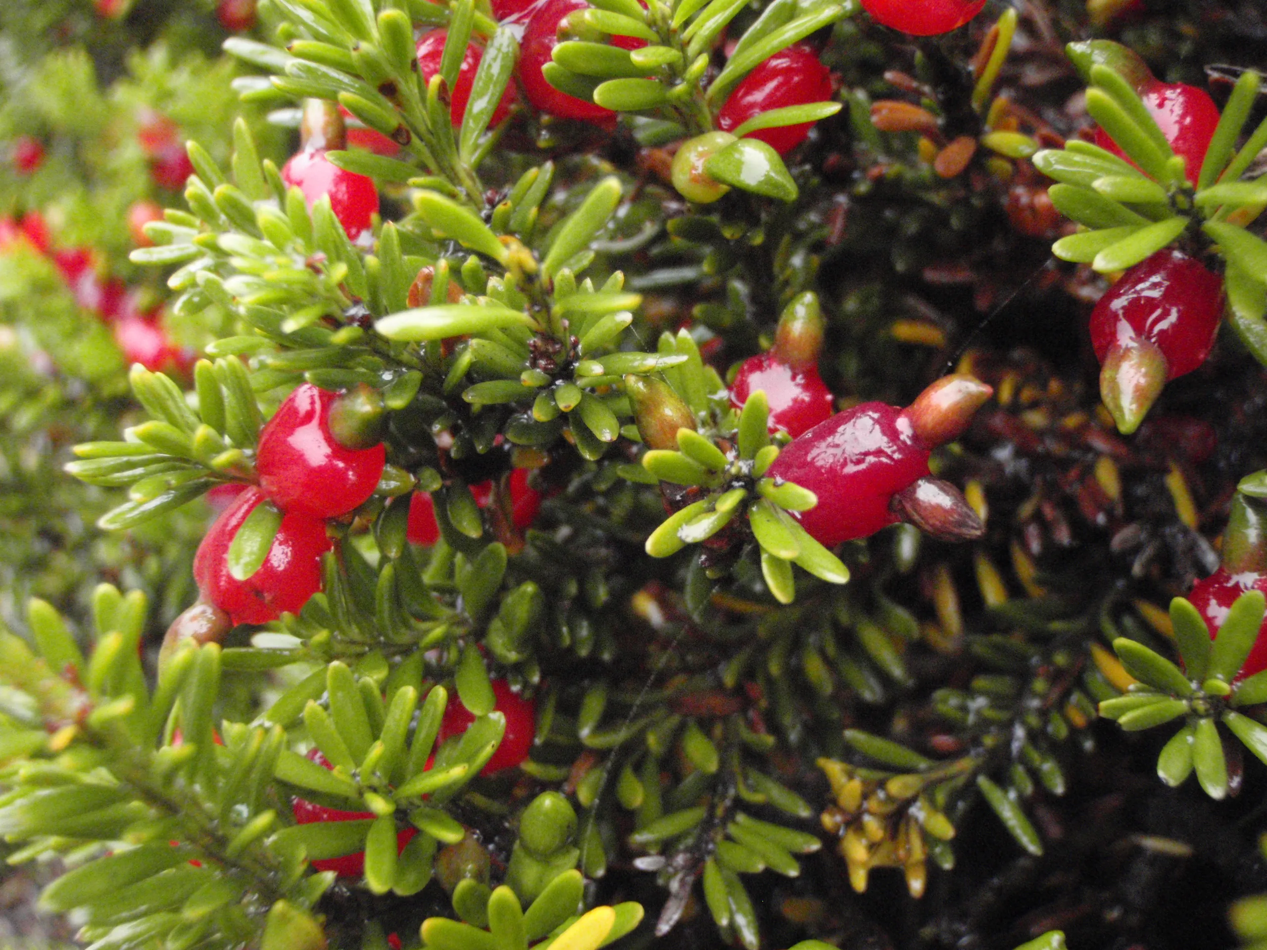 Fruit: Fleshy cone – Male plants have tiny cones which scatter pollen in season. Female plants have small red fruits with the seed attached to the end.