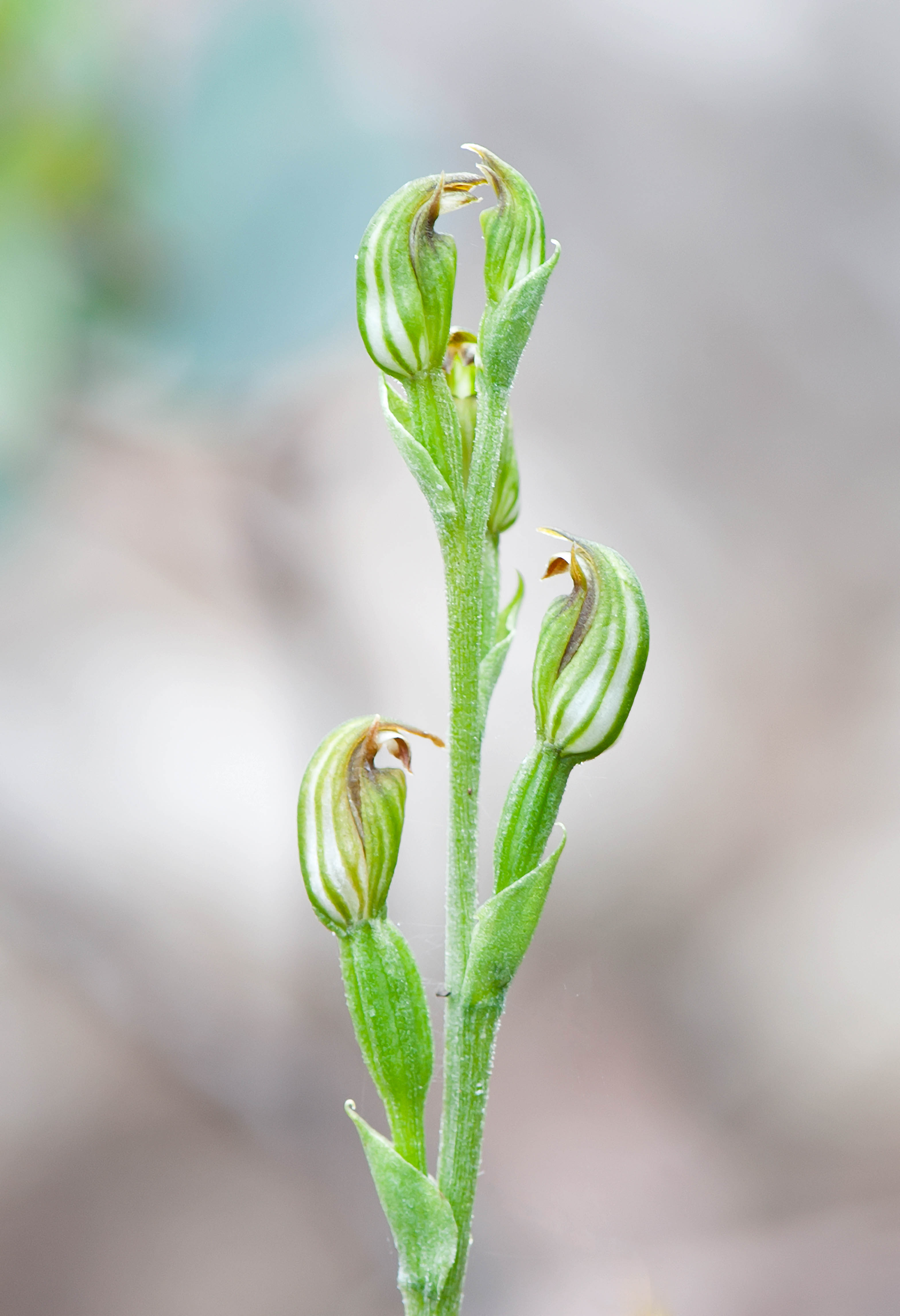 Form Description: A tiny slender multi-flowered greenhood with a wiry scape, 3-6 dark green rosette leaves, margins entire.
