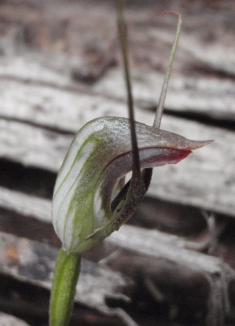 Flowers: A single green and white striped flower, distinctive brownish-maroon markings at the apex. A dark-red labellum is just visible through the sinus opening.
