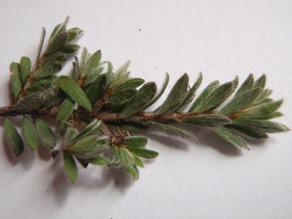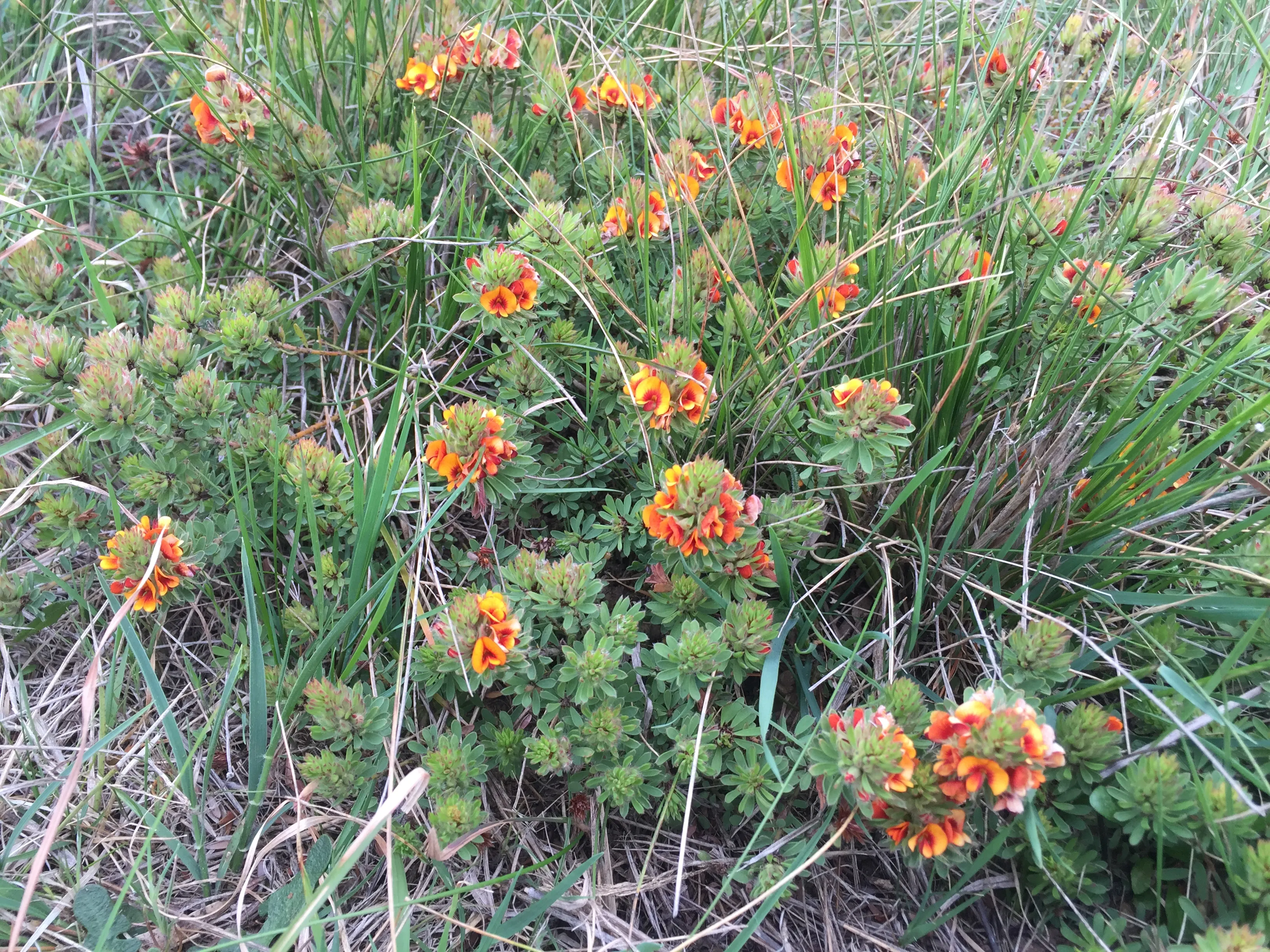 Flowers: Pea flower, orange-yellow on short stems crowded into clusters near ends of branches.