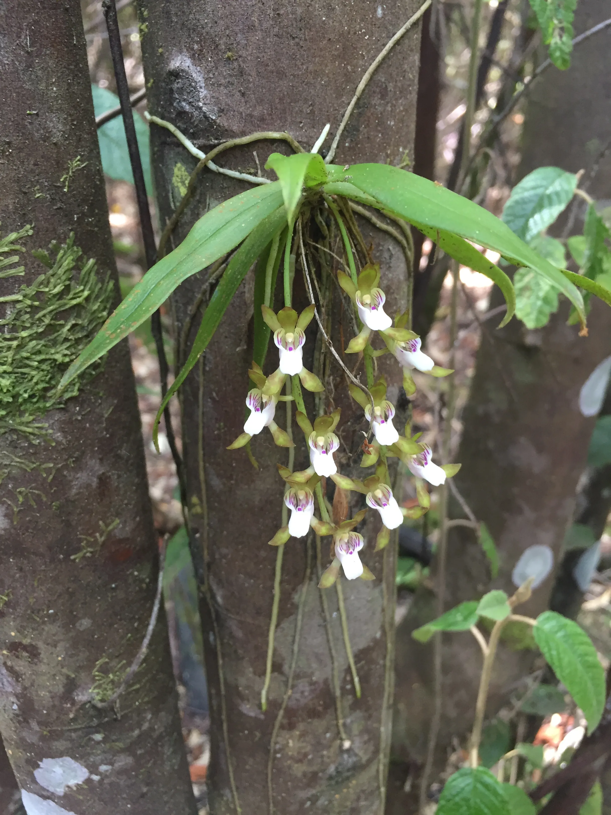 Form Description: A small, pendulous, epiphytic orchid, with a tuft of 3-10 linear leathery, dark-green leaves and long roots.