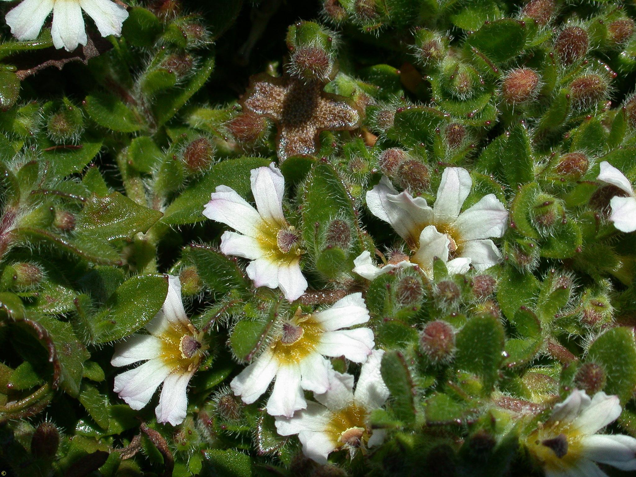Flowers: Shortly stalked with 5 white petals each with red or brown on the back.