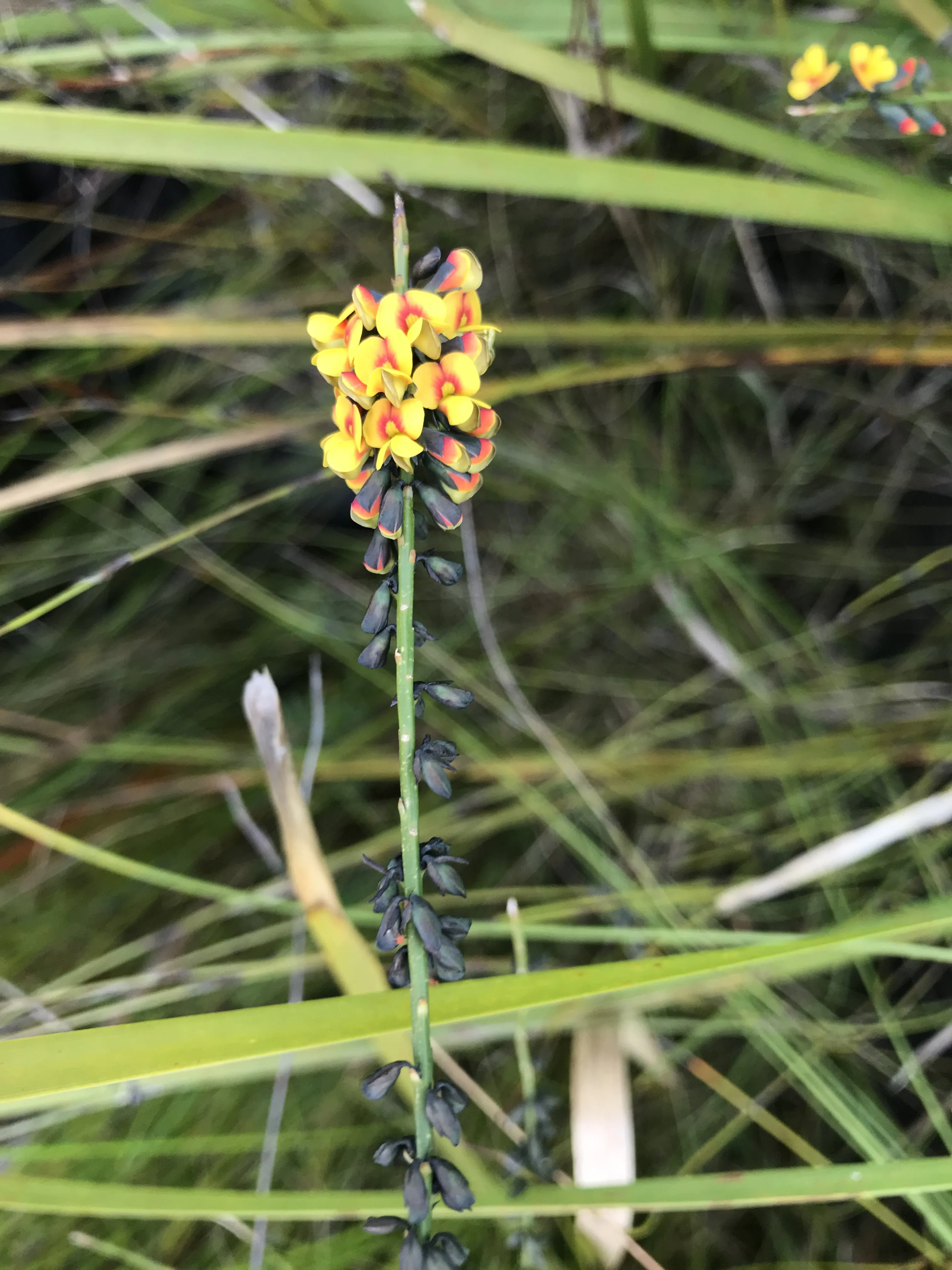 Flowers: Pea, small, yellow often with red markings, in long terminal sprays, arranged in twos or threes.