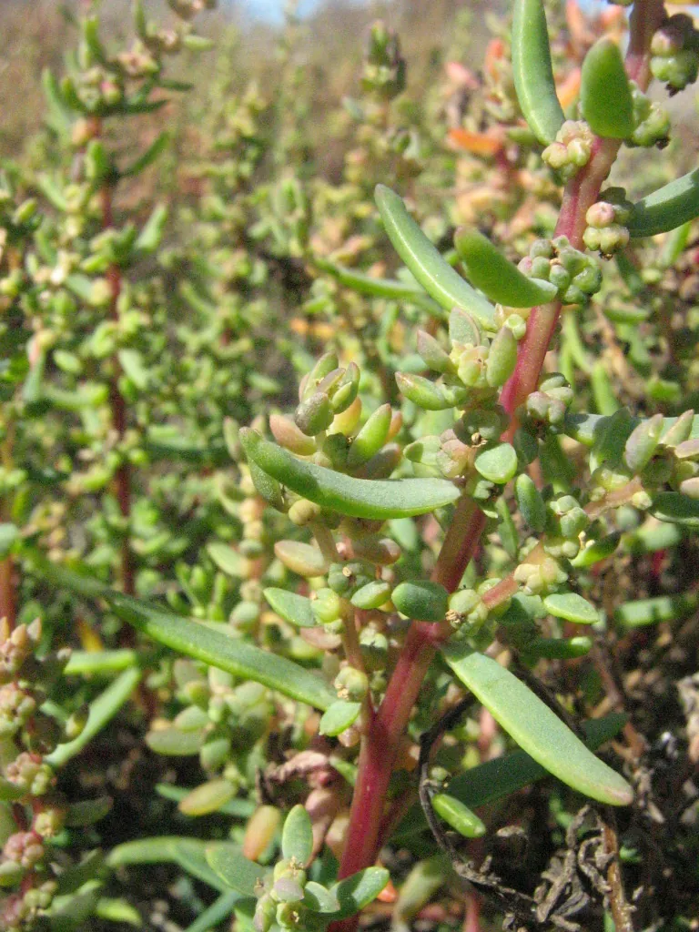 Form Description: Upright or spreading low shrub, with succulent, opposite or alternate leaves, to 3cm long. Lower leaves often larger and red to purple, upper leaves yellowish. Stems are reddish.
